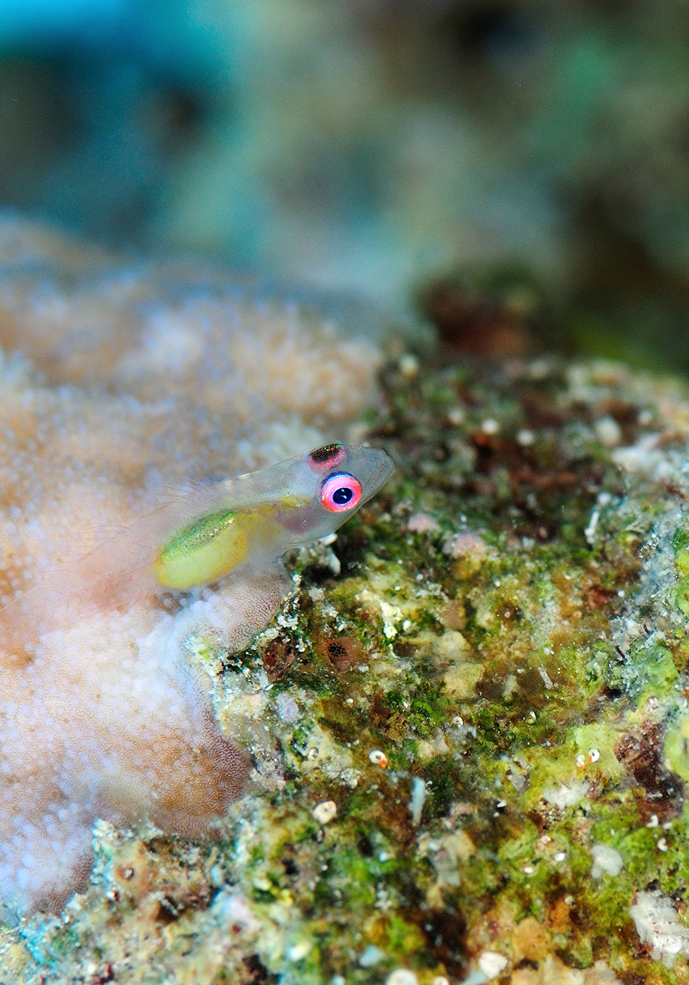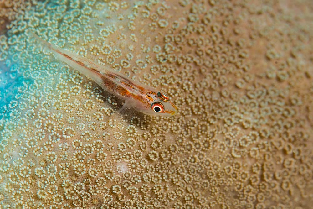 On occasion fish play nicely and spend their lives on a surface, meaning their movements are more predictable, such is the case with this wee fellow, which I think is Eviota guttata. Like many of its clan it uses cryptic patternation along with transparency to make it harder to find..