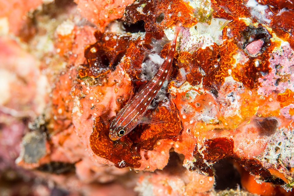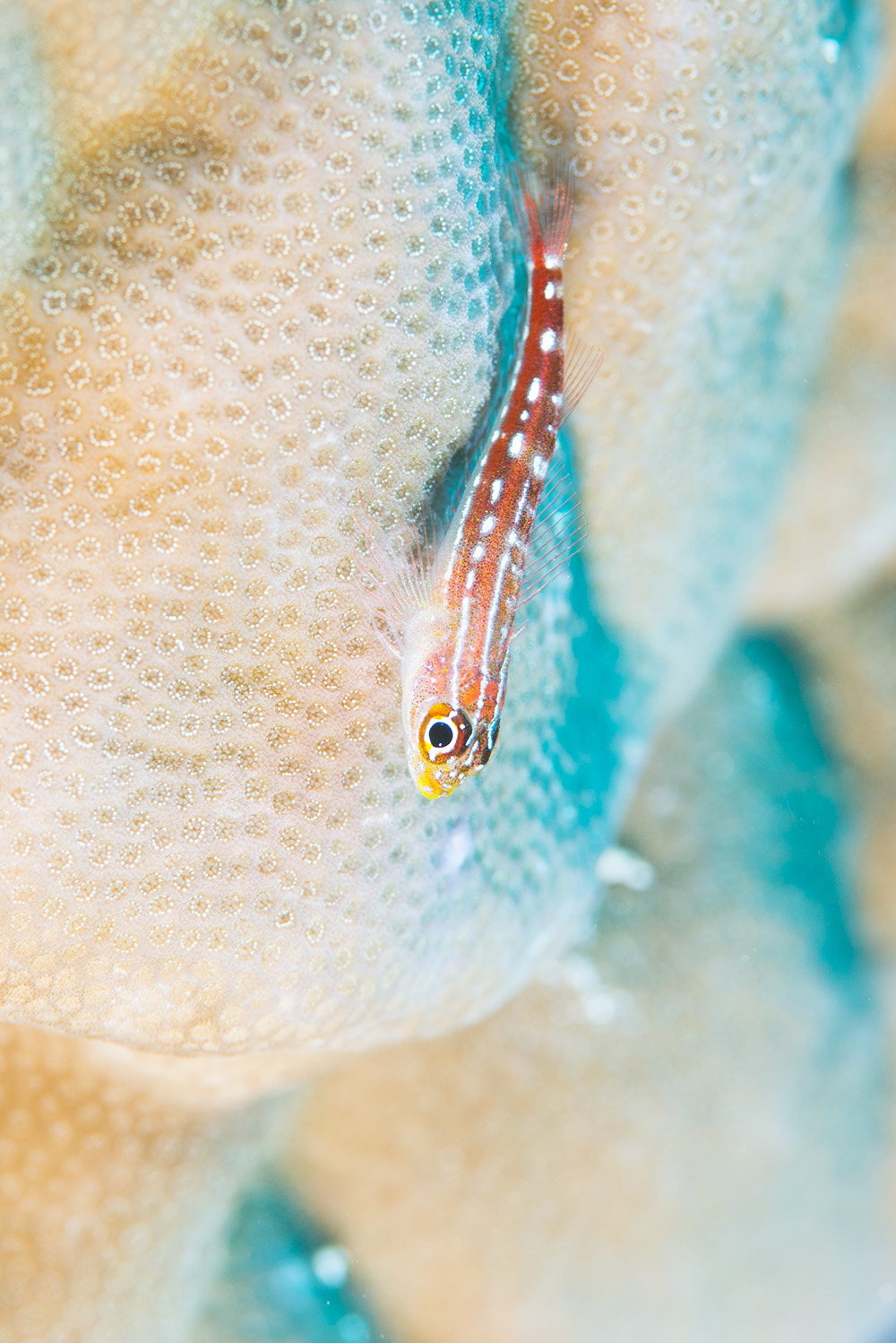 Take this little goby. If I recall correctly it is a member of the large Eviota genus of pygmy gobies that are common throughout the Indo-Pacific. In my experience, they and their clan are very common on certain reefs in the Maldives, where the main shot was taken. On some coral heads, these fish seem to be every twenty centimeters or so away from another of the same genus/species. But I’d challenge anyone to be able to see that from more than a meter away.