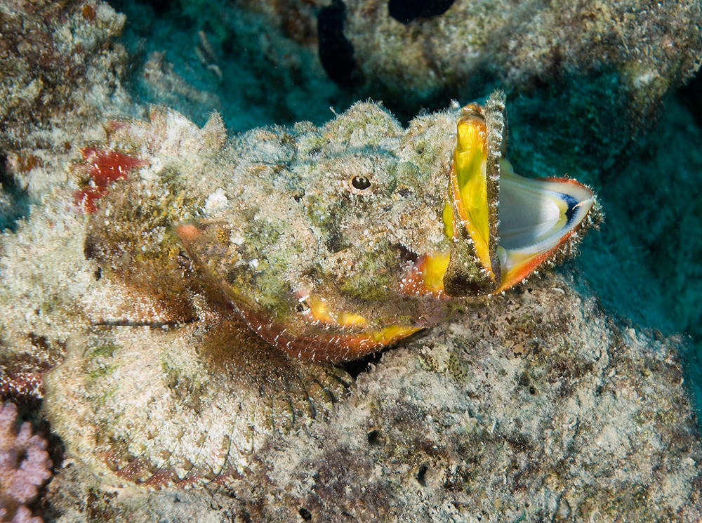 After publishing my last post, I decided to dig out some pictures of Scorpionfish from the Red Sea. In the main image you can see a fish that I only spotted by accident as I slowly finned across some coral rubble. As I recall, I spotted the animal’s eye (in spite of the flap of skin, the lappet, which partly breaks up the eye’s outline). I was fortunate to get a shot of it flexing its jaw muscles which shows just how large their mouths are and how they can engulf prey that wanders too close. I think you’ll be able to see for yourself just how well these fish blend in.