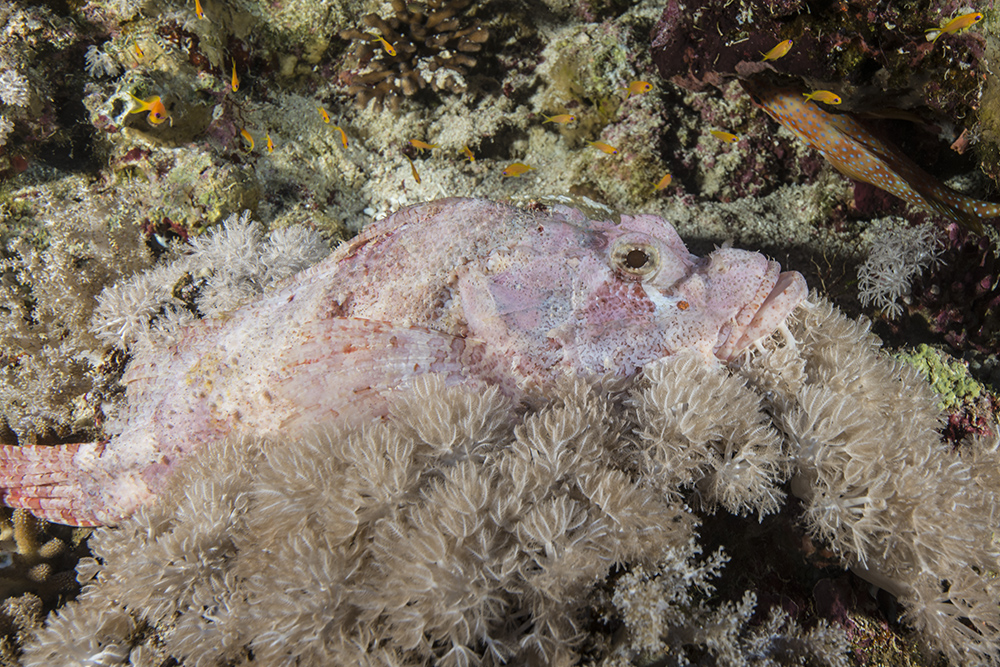 This fish is resting in a head of Porites and really stands out. I imagine that it was recently disturbed, possibly by another diver in my group. I imagine there is also a story behind the the fish pictured below as well. It is sitting amongst a Xeniid and is possibly the palest adult scorpionfish I have ever seen.