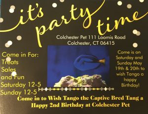 Tango resides at our store and is doing swimmingly. He is one of 27 that were successfully bred in 2016 and I haven’t heard of any other documented successes with them but I’m sure there are people hard at work trying to repeat this amazing feat. Tango is a typical skittish blue tang although I have noticed that he will let you stand closer to his 120 gallon aquarium while he eats. He loves my Dad and will come up to the top and hang out with him. He will come and see me only if I have food. He despises change and hates water changes. He hides out in the corner behind his sponge filter house when we do anything with his home. He lives with an aquacultured Coral Beauty and an aquacultured fire shrimp. He used to live with two clownfish but when they decided they were ready lay eggs they got aggressive. They now reside in their own 80 gallon aquarium. We have had birthday parties for him every year. This year is different due to the lock down and social distancing so I decided to write about him instead.
