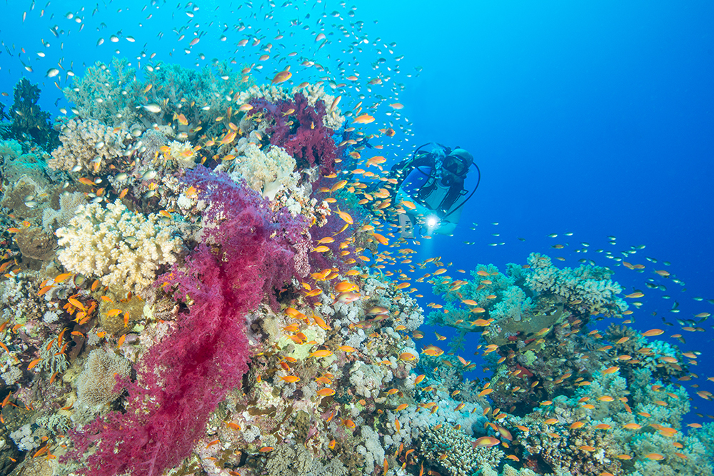 Normally, I don’t like to see people in an image but from time to time it can work and it’s something magazine editors often like. My subject had to fin quite hard into the current. You can see the anthias all oriented in one direction and staying close to the coral – a sure sign of water movement.
