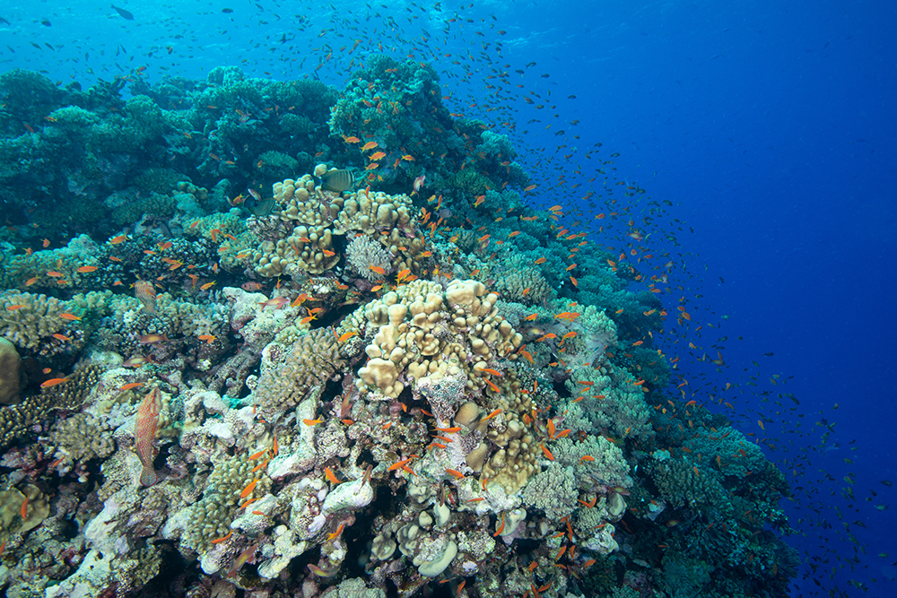 As you can see, part of this reef formed as a distinct crest. This images shows some robust porites colonies taking the stress from the waves and of course, shoals of Pseudanthias squamipinnis, as you’d expect from this part of the world.