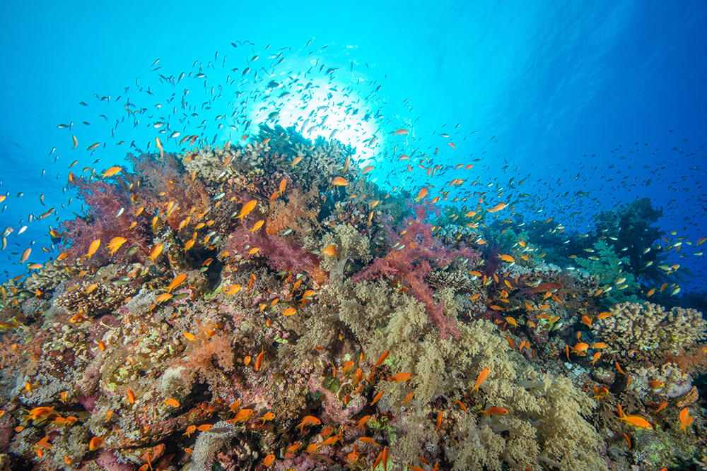 In this image, I used a trick I mentioned in my earlier post. I shot upwards to eliminate shadows and selected a high shutter speed and narrow aperture to reduce the amount of light from the surface that reaches the camera. This makes the sun more distinct and captures a deeper blue. My strobes take care of illuminating the foreground. Again, anthias are everywhere!