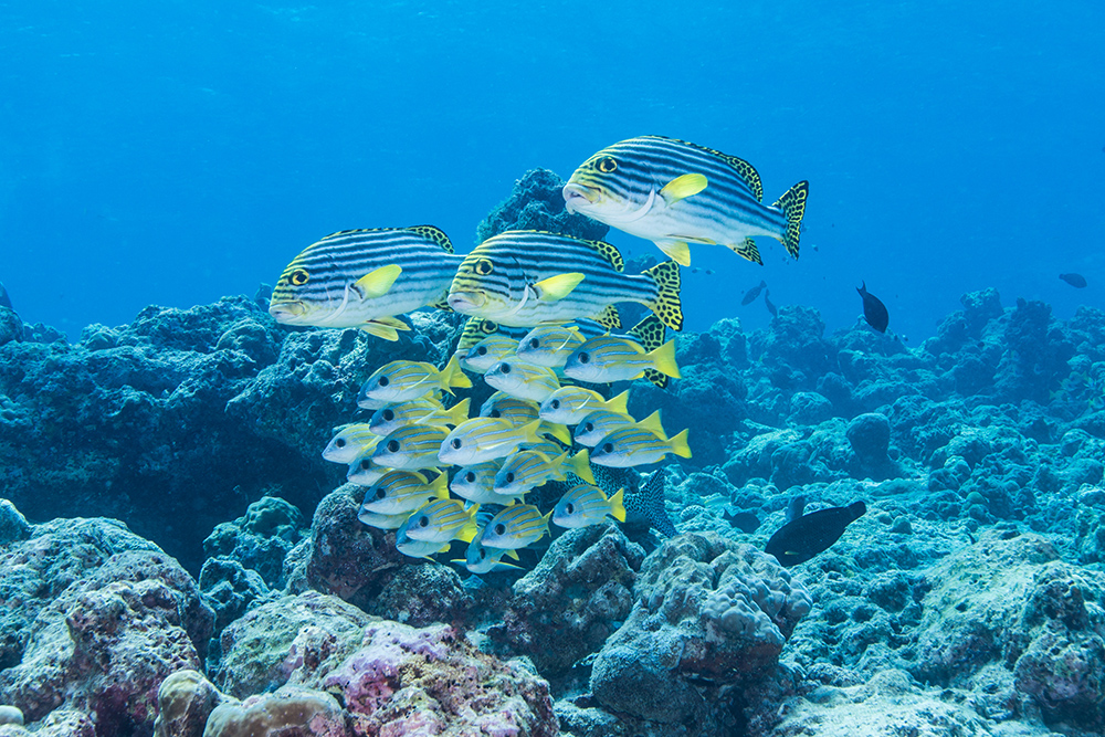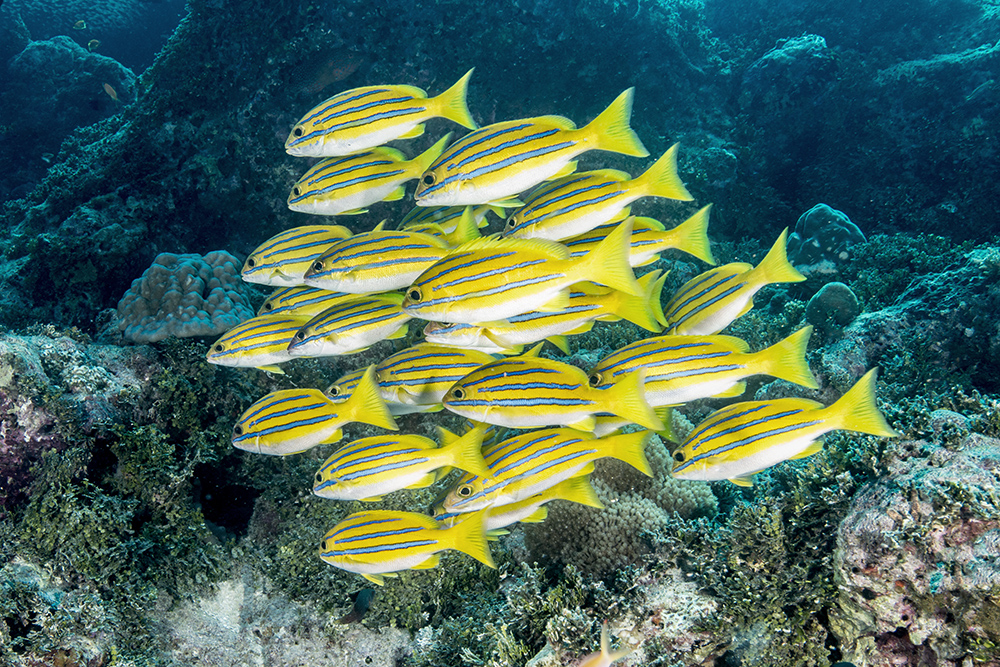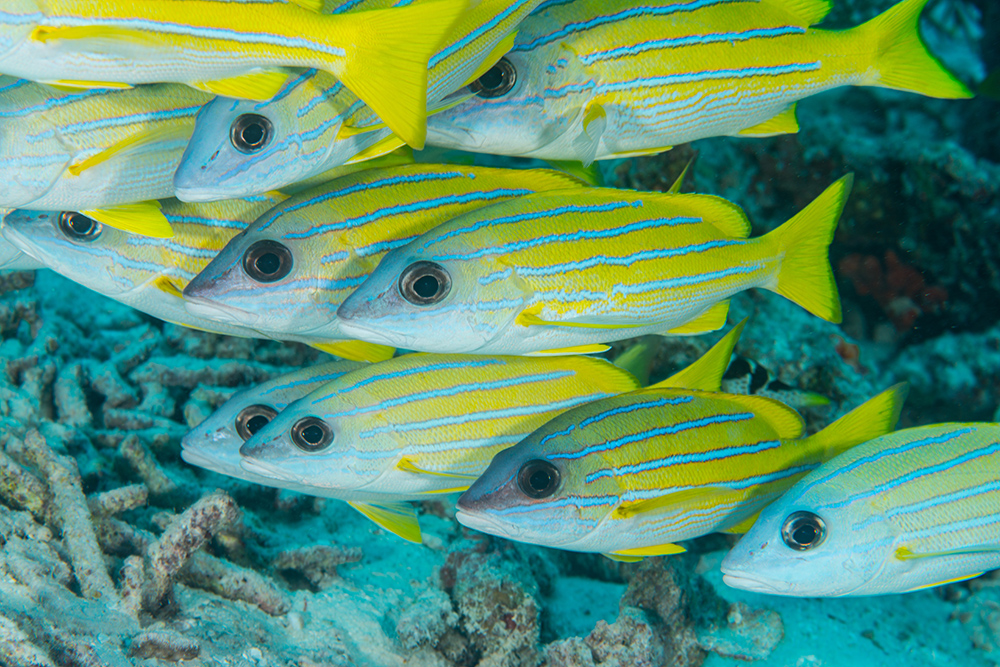 As I mentioned in my last post, there’s nothing quite like a powerful image of vivid yellow fish against a blue background to shout “sunlit tropical reef” to the viewer. That’s why I always try to shoot a shoal of yellow fish whenever I can to add some punch to a set of images.