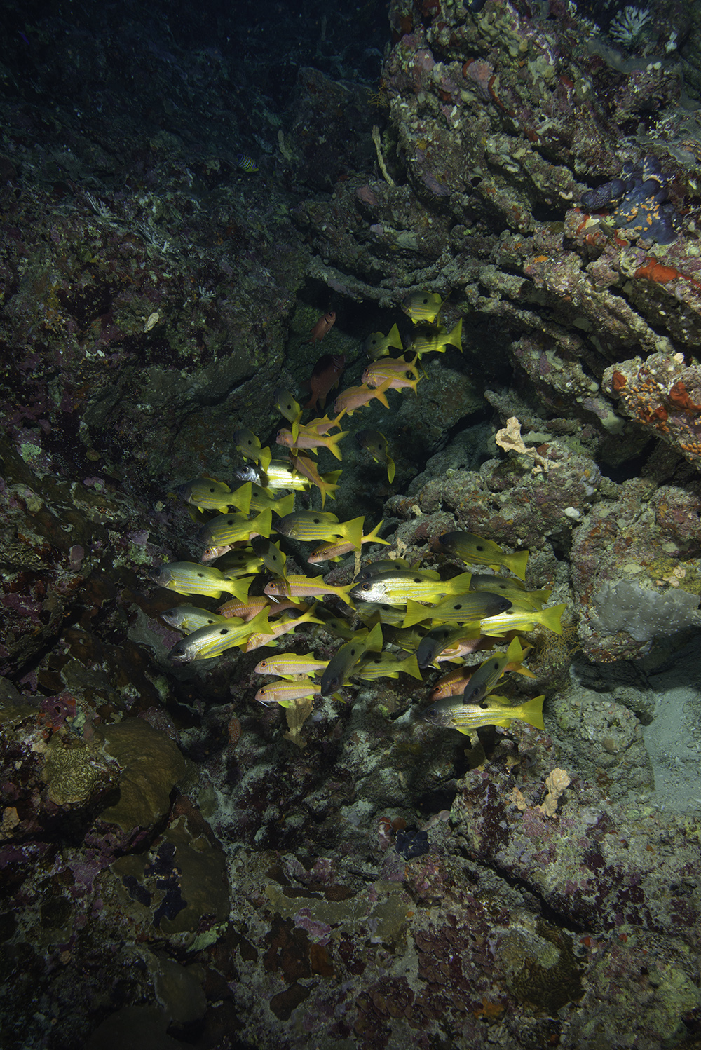 Sometimes snappers will shoal with other species, in this case with Oriental Sweetlips (Plectorhincus vittatus), again from the Maldives.