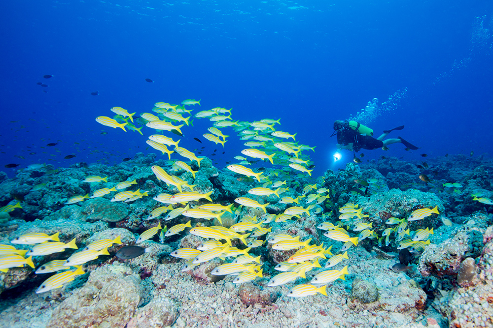 This group of L. kasmira really helps this shipwreck image. The shoal below looks great with the diver.