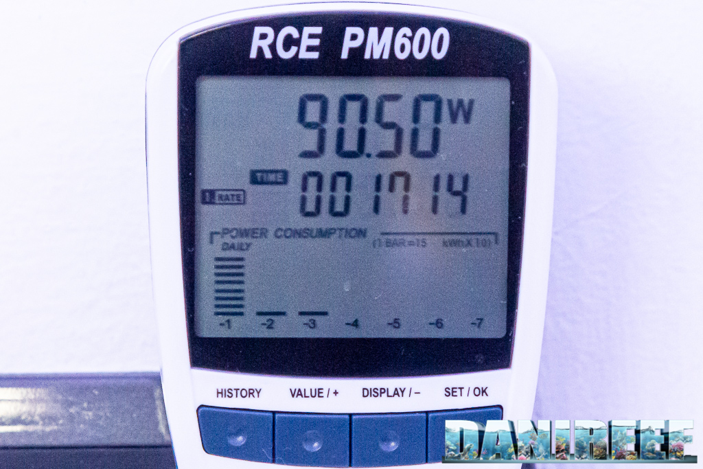 The energy per watt is lower than the similar Aqamai LRM; we think it is because of the additional LED channel (not counting the moonlight channel). So, the more the LED that are white, the higher the efficiency, the more you consider the sides, especially UV and Purple, the lower the efficiency. It’s the price you pay for a wider spectrum.