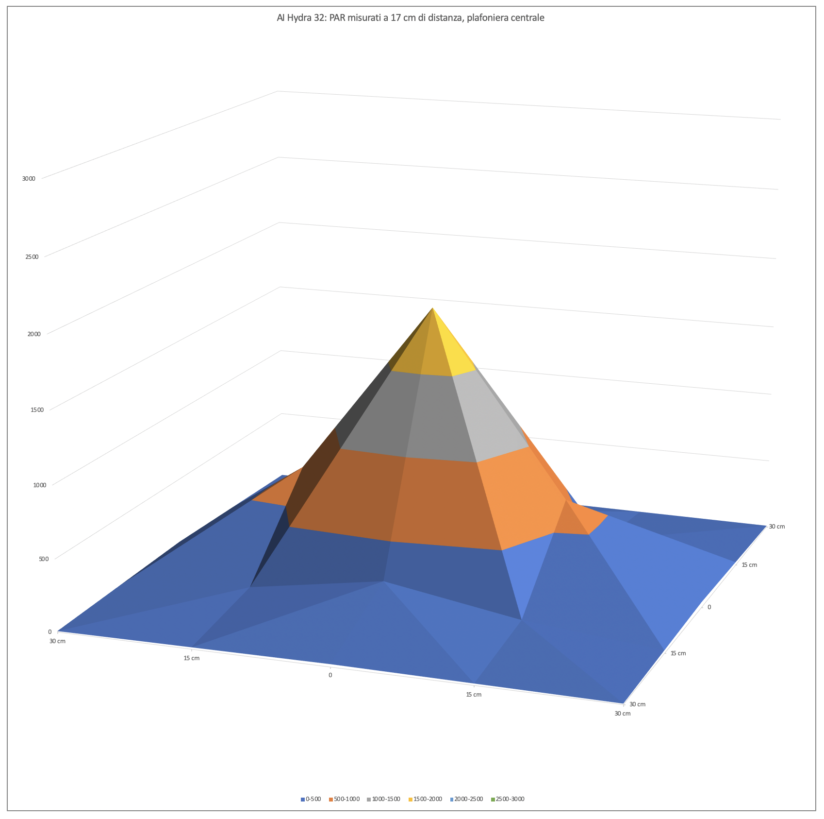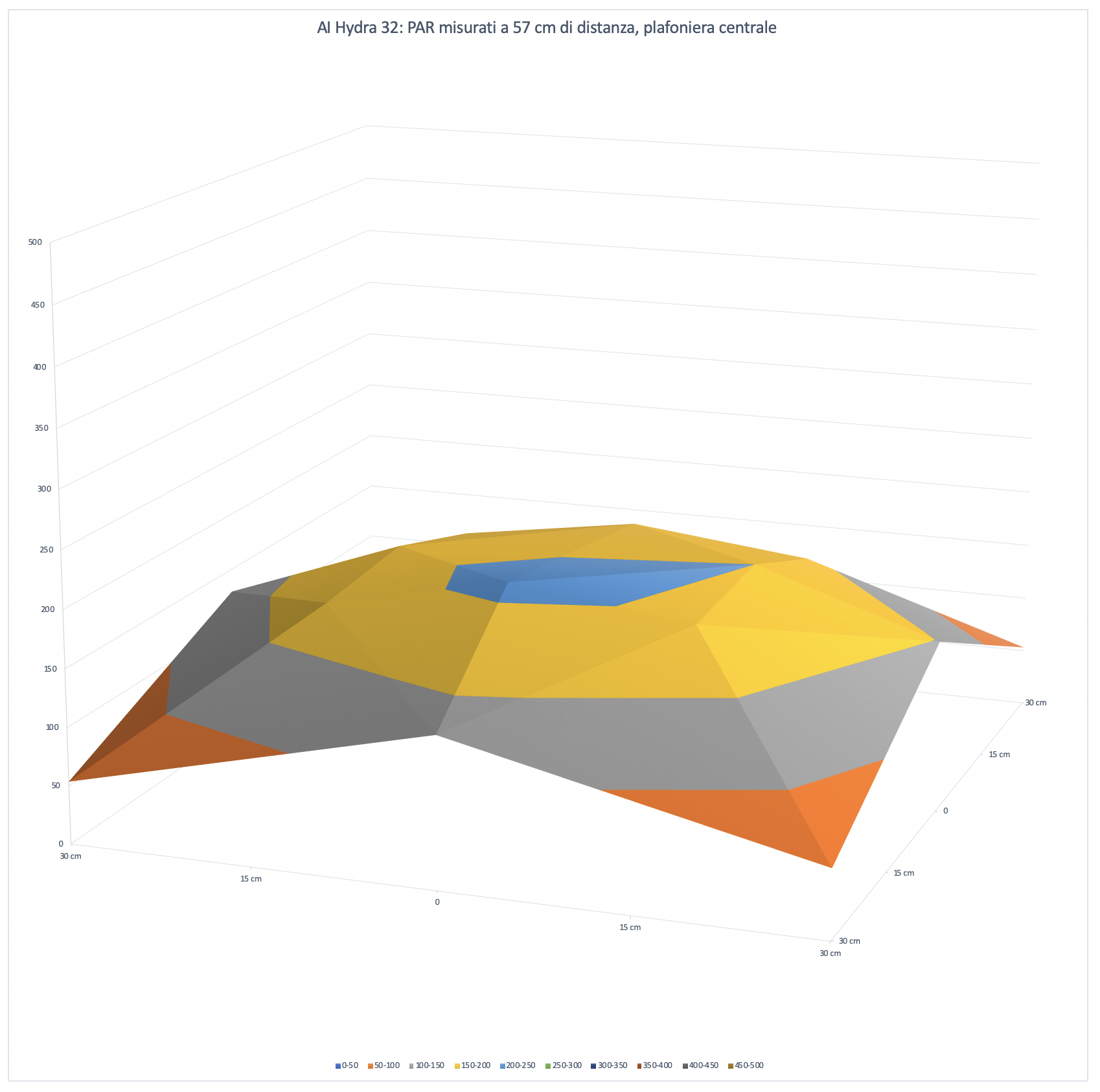This is the most significant and most comparable data. The energy variation. We calculated the volumes of the three surfaces previously seen. It’s obvious that moving away from the ceiling light the PAR decrease, but the light illuminates a wider space. In this way you can consider all the light energy contained in the 60×60 cm area subtended by the ceiling light. And the three values 560,185, 563,232 and 462,614 assume a different connotation compared to the values in the middle. While the first decrease because of the increasing of the distances, the subtended area, that is the energy, decreases less, because the main part of the lighting is in the middle.