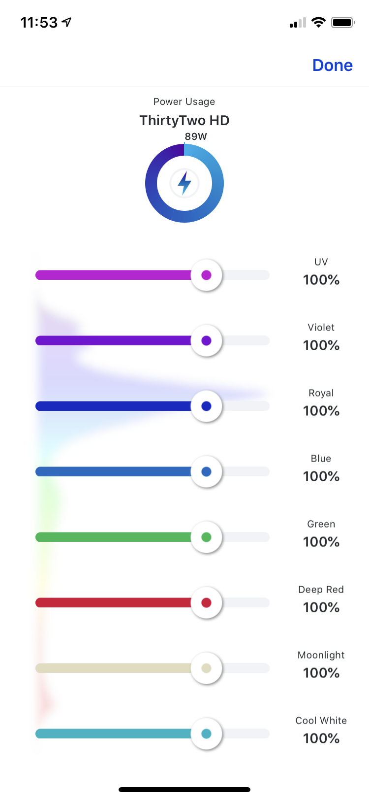 Notice that the app will show you the absorbed power, and then you can see the resulting light spectrum. One of the best features of the HD series from AquaIllumination is that it can go over the 100% mark on each channel when the other channels are unused.
