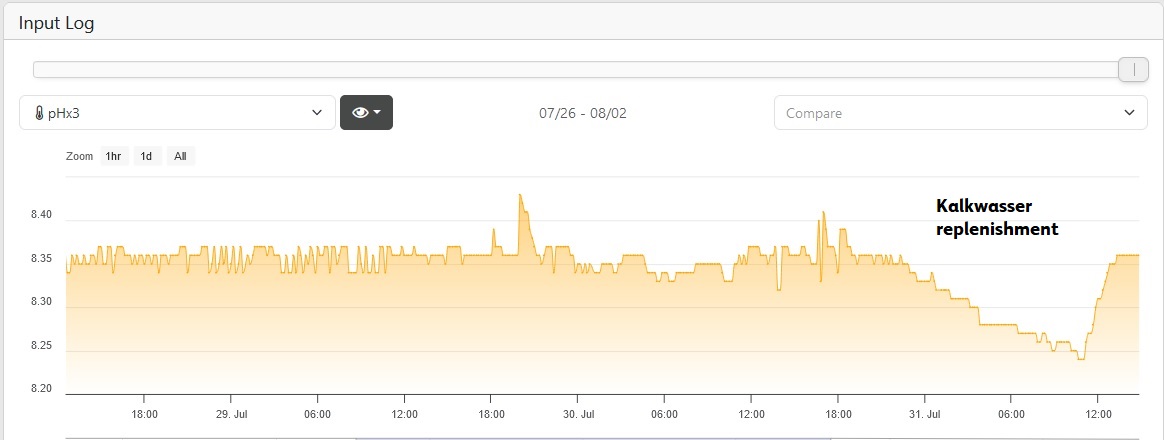 Like all systems, this tank had its up and downs. That is the nature of the hobby. Right now the system has been on cruise control for a while. The only change recently was the need to start manually dosing the DIY Randy Holmes-Farley 2 Part to bring the alkalinity back from 6.7 to the target 8.75 dKh. This indicates the coral growth demands have exceeded what kalkwasser dosing was able to supply. The Ice Cap KM-120 KalkReactor has kept the pH in the 8.3-8.4 range pretty consistently. The only time it dips is when calcium hydroxide needs to be replenished. (See chart below) Tip: To reduce the daily sinusoidal pH swings we were battling I had to keep the KalkReactor stirring 24/7.