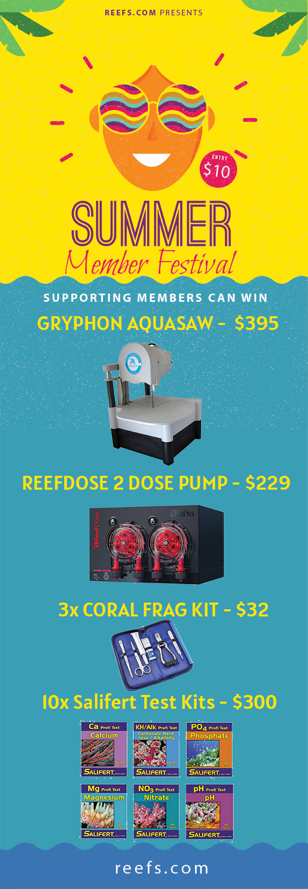 Our friends over at Reefs.com are having a Member Festival. Membership is $10.00 for the year and by becoming a supporting member you will have a chance to win a Gryphon AquaSaw (valued at $395.00) or a ReefDose 2 Dosing pump from Red Sea (valued at $229.00). They are also giving away a frag tool kit ($32.00) and a 10 pack of Salifert test kits valued at $300.00 to name a few. In all, they will be giving away over $3000.00 in raffle prizes. If you are not familiar with Reefs.com then it’s worth a visit. The sites features a blog, public forum and a magazine. Also they feature some of the articles we publish here at AquaNerd.com. Hop on over to Reefs. MORE