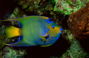 The Queen Angelfish is a truly beautiful fish that’s found in the tropical waters around the Bahamas, Brazil, off the Florida coast, and in the Gulf of Mexico. Queen Angels are a startling electric blue with yellow scales and a brilliant yellow caudal. On the fish’s forehead MORE