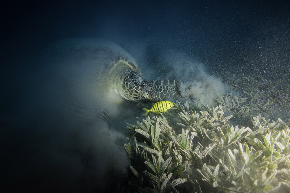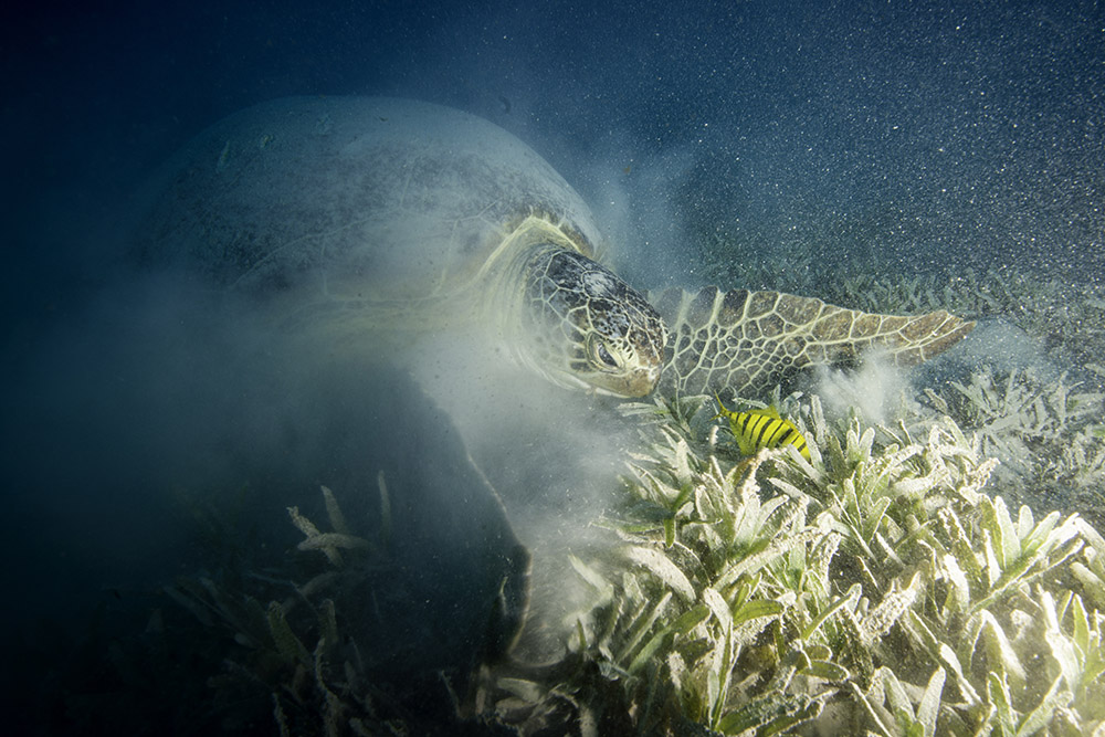 I came across a Green turtle in the Red Sea, whilst looking for interesting creatures in the seagrass. I assume this animal was used to divers as it took no notice of me or my companions and carried on chomping away.